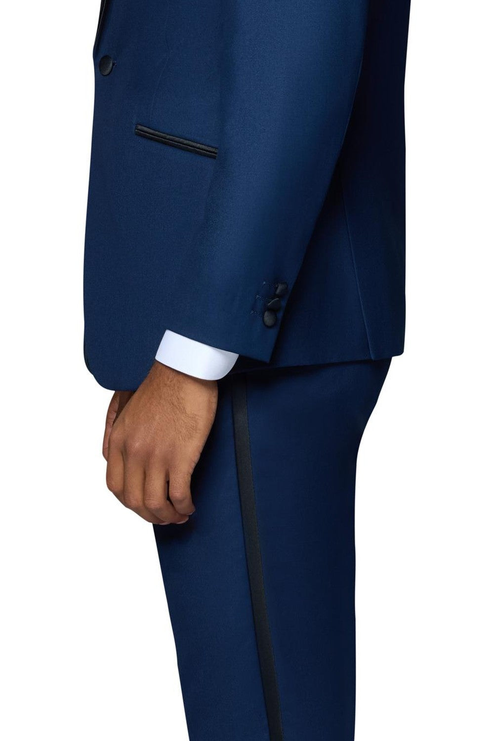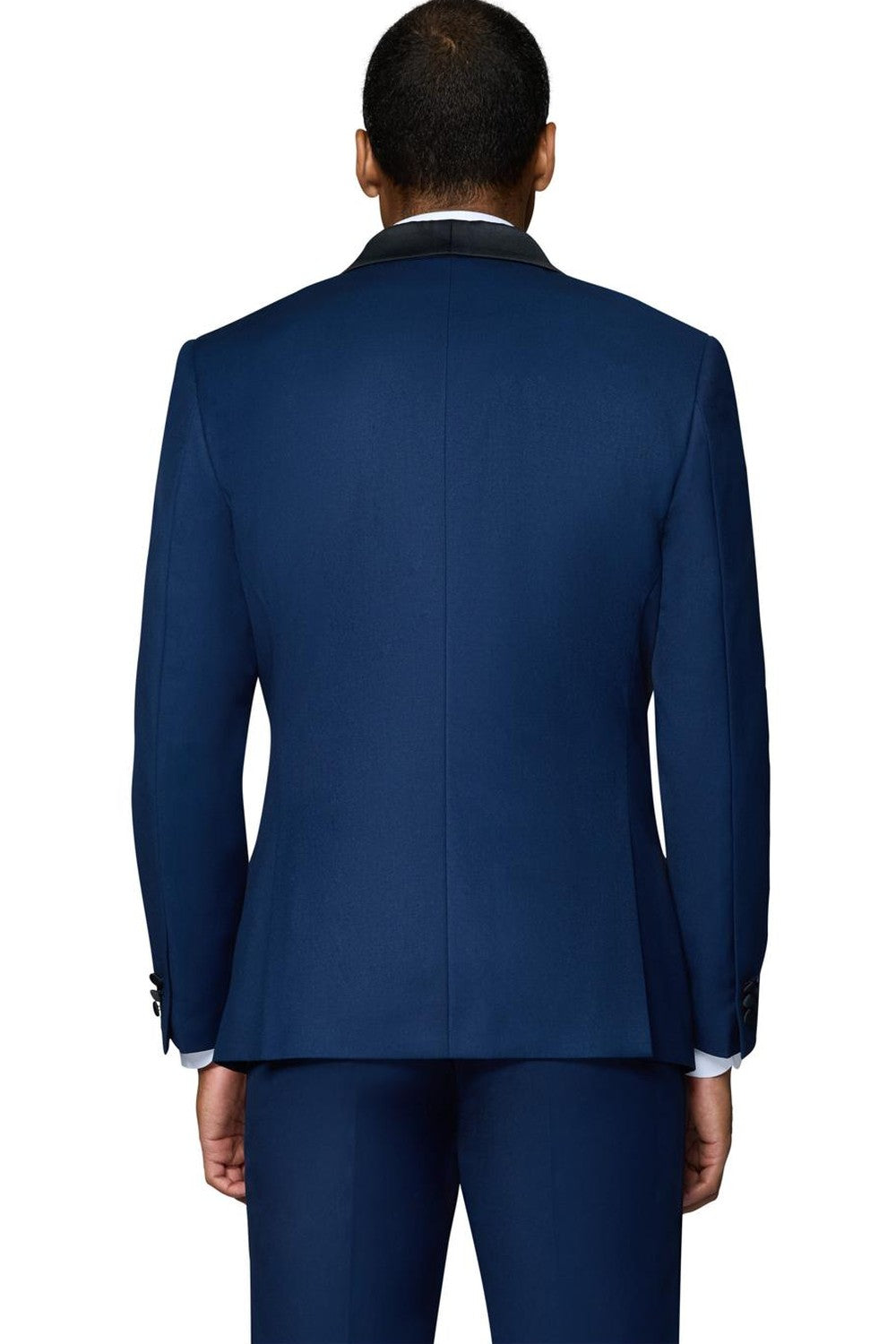 The "Winslow" New Blue Tuxedo, designed by Bergamo Elegant, is hand-tailored in a signature modern fit or slim fit and crafted using a Super 150's luxury viscose blend fabric. The relatively high thread count of this 100% viscose blend fabric ensures a soft, luxurious feel that one would expect from Berragamo. The front of the jacket features shawl lapels which are detailed in a black premium satin. The front enclosure features one button wrapped in coordinating black satin fabric while the dual lower front besom pockets, highlighted in the same black satin fabric, unify the look. A top welt pocket is located on the left side of the jacket to properly store a pocket square. Darts stitched down the front of the jacket are tailored to perfection giving a desired tapered shape to the garment. Towards the cuff of each jacket sleeve, there are vented sleeves with satin-faced buttons once again showing that no details were overlooked in design. As we rotate towards the back of the jacket, we notice dual side vents providing a modern, updated look. Lastly, let's not forget the interior of the jacket. Silky soft interior lining complemented with plenty of pocket storage provides an ultra comfortable formal wear experience.