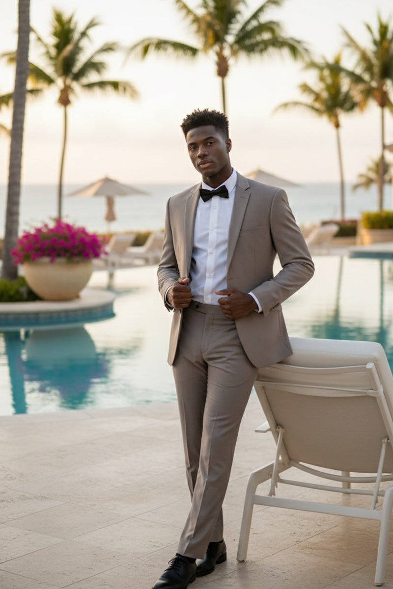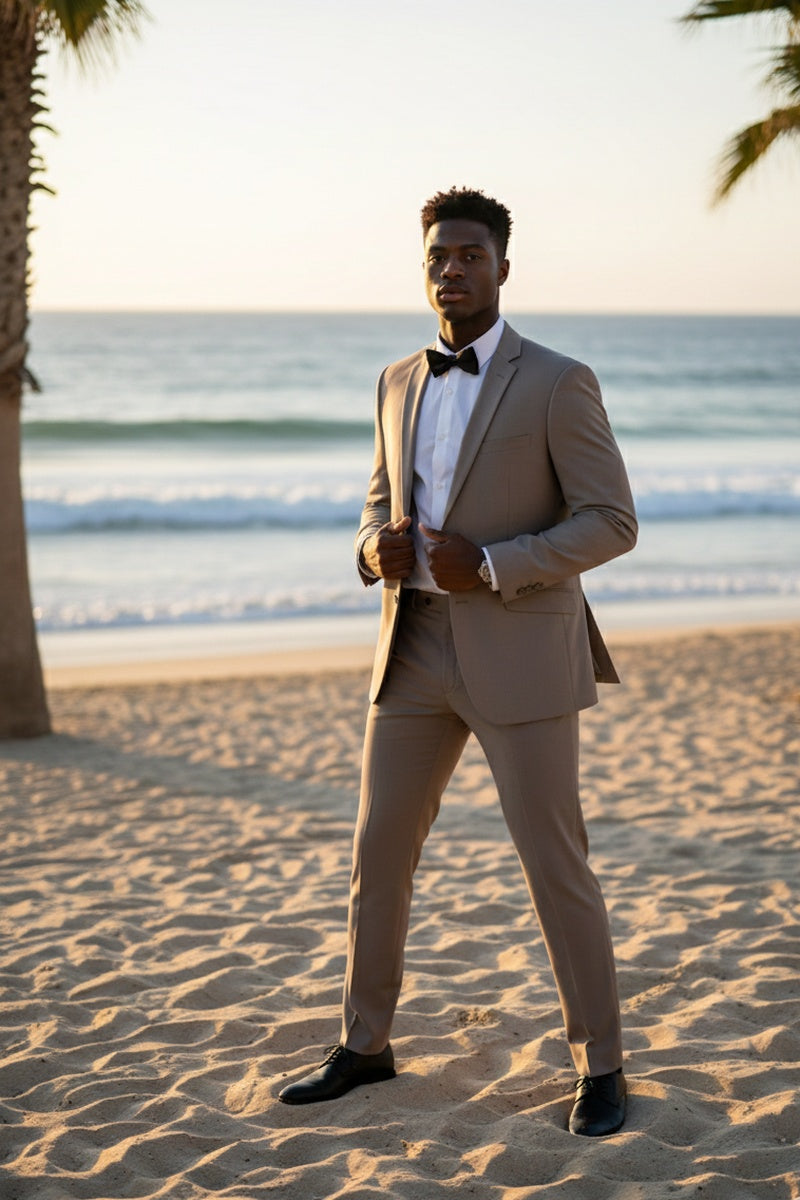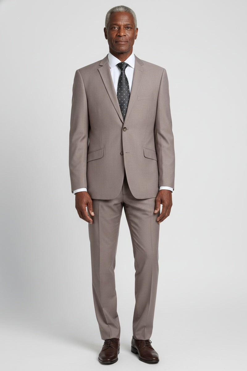 The Rafael Warm Taupe Suit, designed by Renoir, is hand-tailored in a signature classic fit and crafted using a Super 150's luxury viscose blend fabric. The relatively high thread count of this viscose blend fabric ensures a soft, luxurious feel that one would expect from Renoir. The front of the jacket features notch lapels. The front enclosure features two buttons and dual lower front besom pockets. A top welt pocket is located on the left side of the jacket to properly store a pocket square. Darts stitched down the front of the jacket are tailored to perfection giving a desired tapered shape to the garment. Towards the cuff of each jacket sleeve, there are vented sleeves with satin-faced buttons once again showing that no details were overlooked in design. Lastly, let's not forget the interior of the jacket. Silky soft interior lining complemented with plenty of pocket storage provides an ultra comfortable formal wear experience.