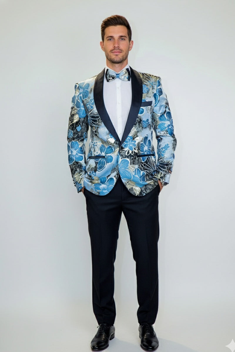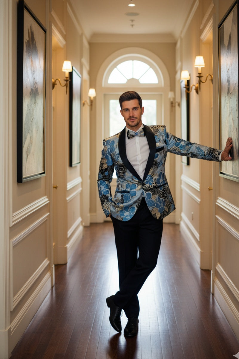 "Monte Carlo" Blue Tuxedo Jacket, designed by Xander Xiao, is crafted using a beautiful woven fabric in an intricate modern floral pattern.