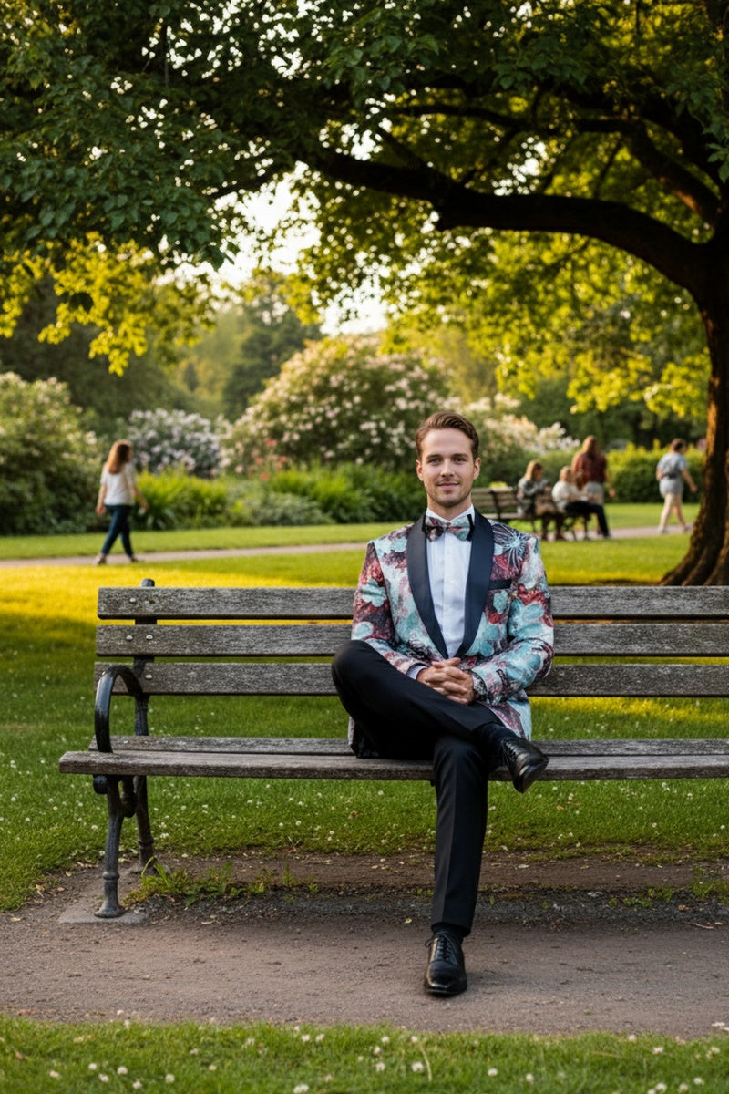 "Monte Carlo" Red Tuxedo Jacket, designed by Xander Xiao, is crafted using a beautiful woven fabric in an intricate modern floral pattern.