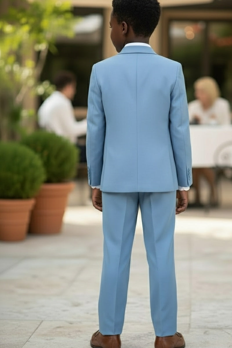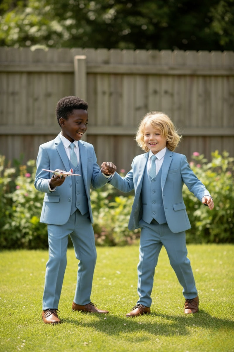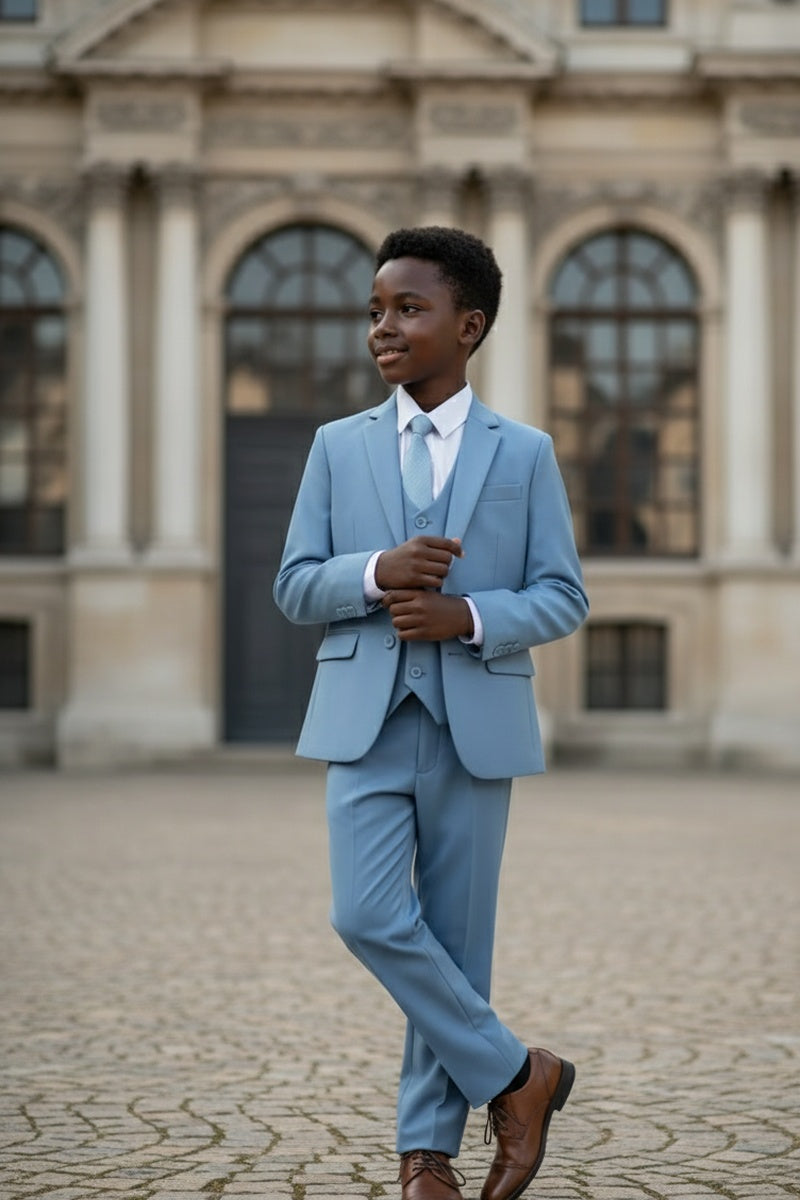 The "Noah" 5-Piece Suit Set, designed by Perry Ellis, is part of our Signature Collection. The 2% stretch is woven into the jacket, pants, and vest fabric to provide additional comfort. Other upgraded features include 3-button vented sleeves on the jacket, french-faced interior lining, and a premium textured cotton blend shirt to elevate the overall look. The expandable waist feature and adjustable vest & necktie were designed to make it easier to fit your little one.