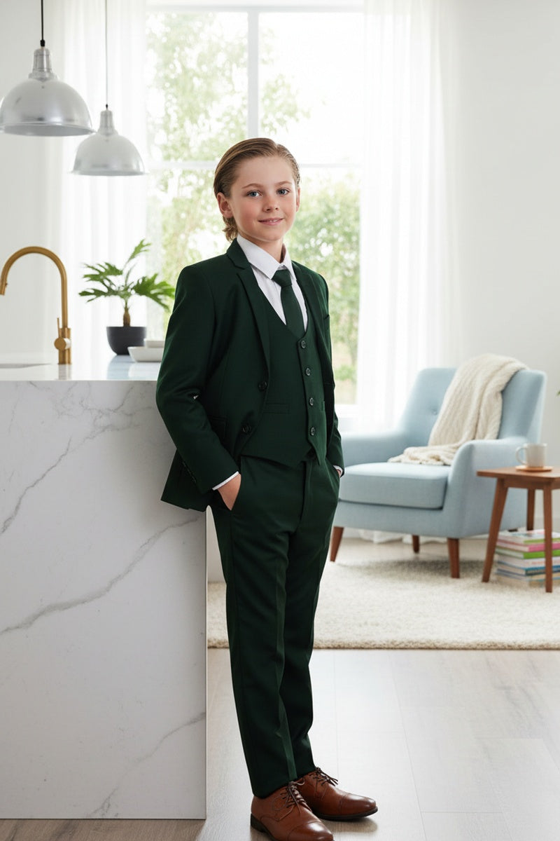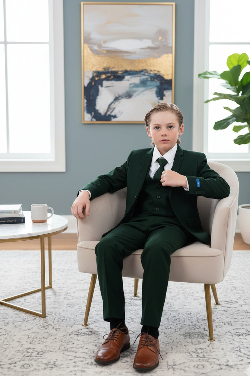 The "Noah" 5-Piece Suit Set, designed by Perry Ellis, is part of our Signature Collection. The 2% stretch is woven into the jacket, pants, and vest fabric to provide additional comfort. Other upgraded features include 3-button vented sleeves on the jacket, french-faced interior lining, and a premium textured cotton blend shirt to elevate the overall look. The expandable waist feature and adjustable vest & necktie were designed to make it easier to fit your little one.