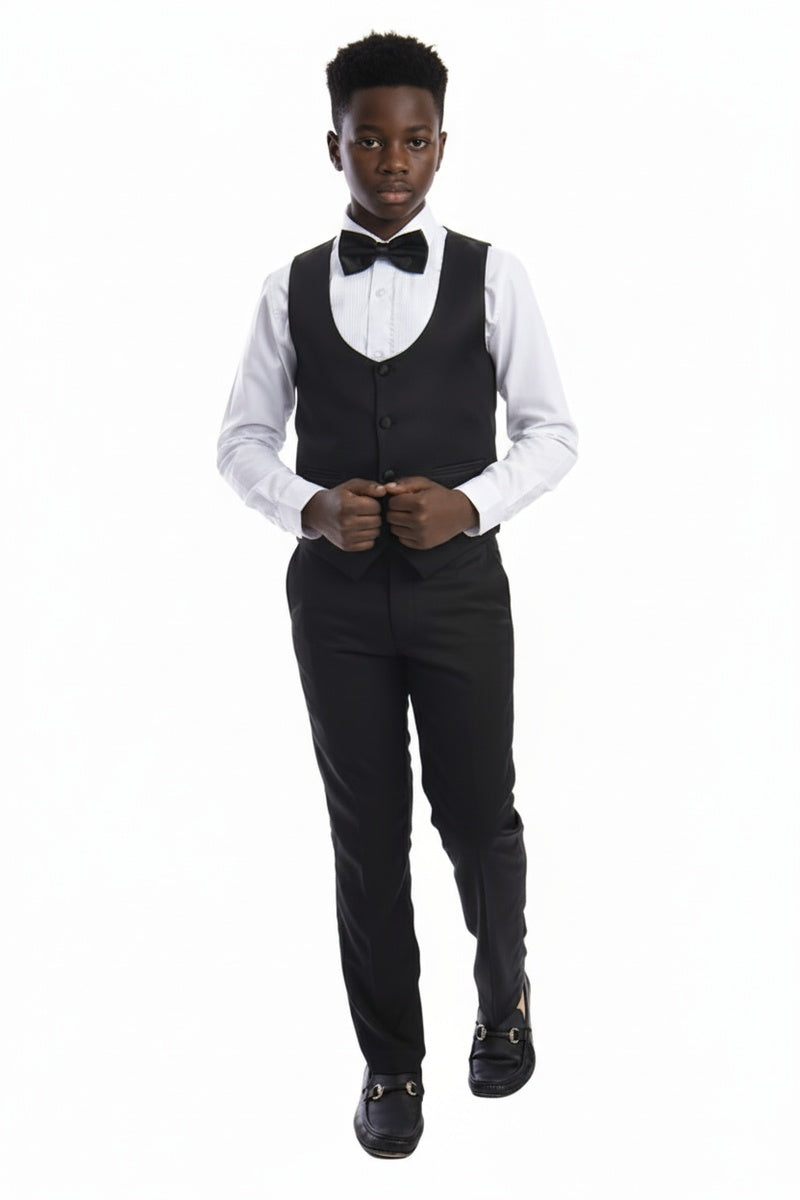 This 5-piece set includes the jacket, pants, shirt, vest and tie.