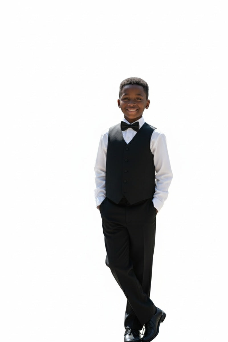 The "Prodigy" 5-Piece Tuxedo Set, designed by Little Tuxedos, is part of our Essentials Collection. At an attractive price point, the Essentials Collection is one of our best sellers! Available in both classic fit and husky fit, the Essentials will accommodate kids of different shapes & sizes. Kids also love to show off the interior blue abstract premium lining! An expandable waist feature, adjustable vest, and adjustable necktie provide additional comfort for your little one.