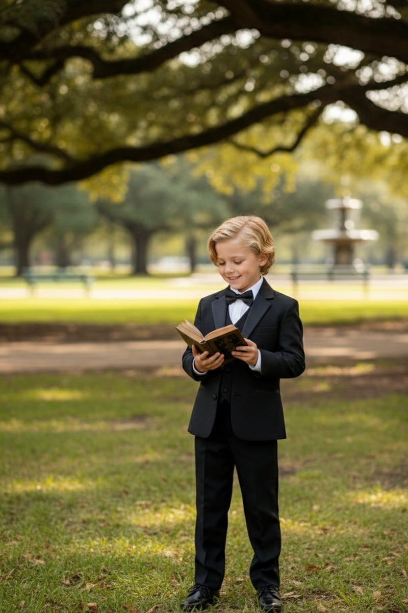 Featured on TheKnot.com The "Prodigy" Black 5-Piece Kids Set is featured in TheKnot.com's exclusive fashion gallery.