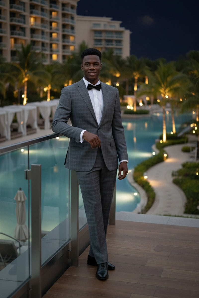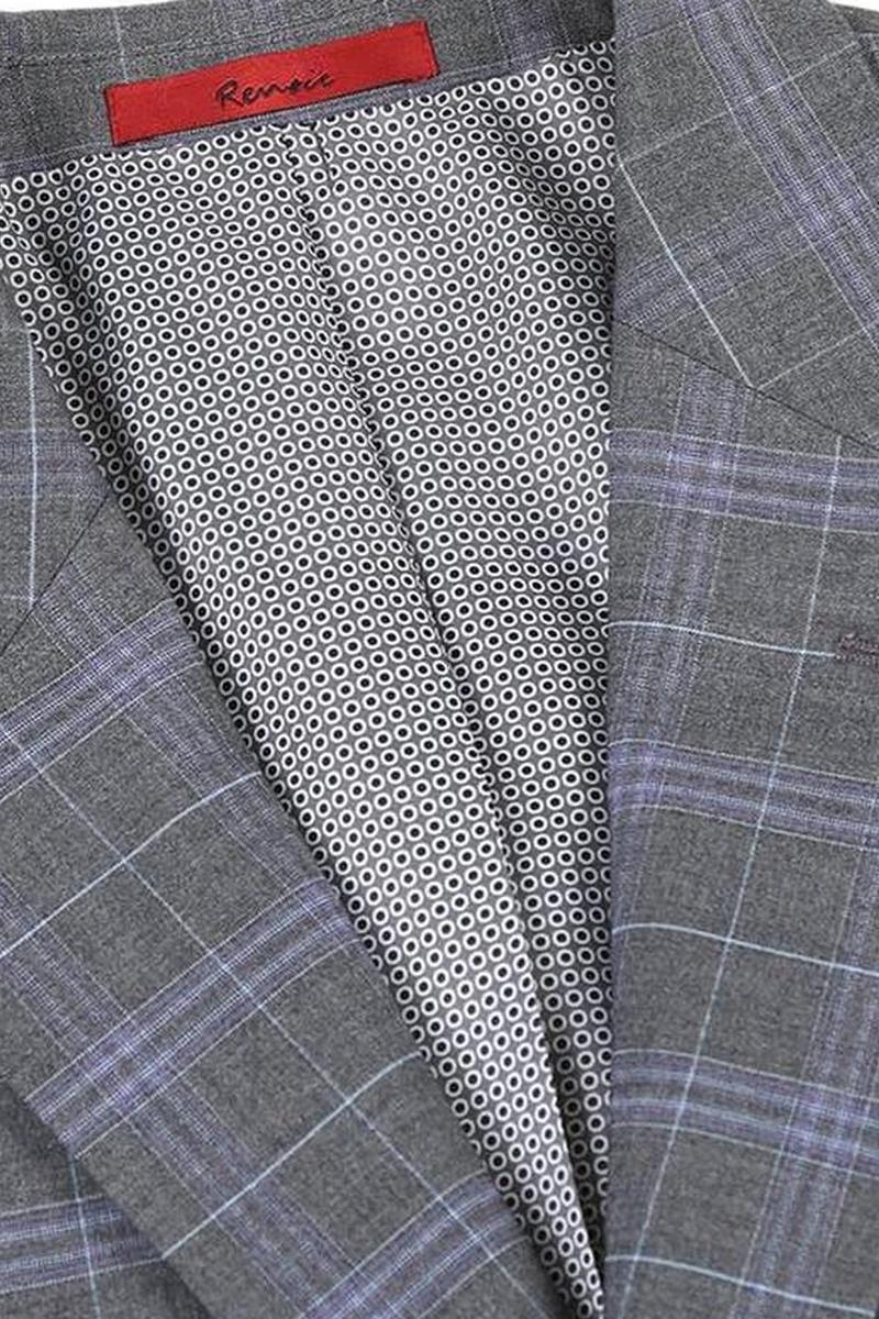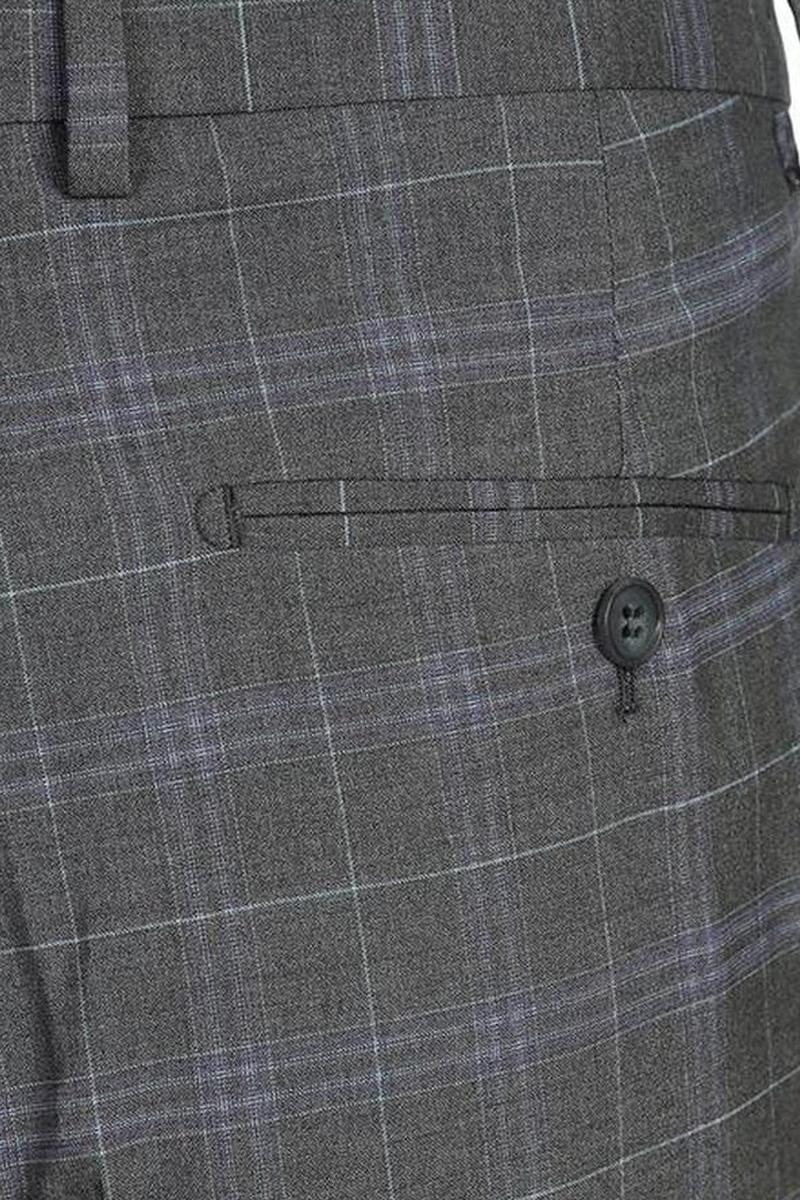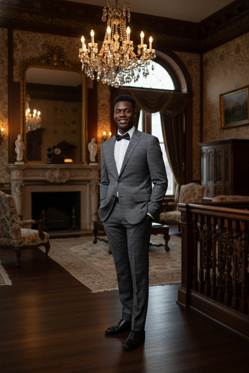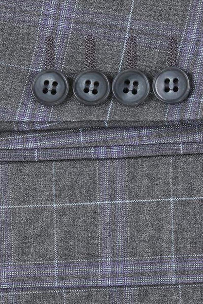 The Dimgrey Windowpane 2-Button Notch Suit, designed by Renoir, is hand-tailored in a signature classic fit and crafted using a premium poly-rayon stretch fabric. The front of the jacket features notch lapels. The front enclosure features two buttons and dual lower front besom pockets. A top welt pocket is located on the left side of the jacket to properly store a pocket square. Darts stitched down the front of the jacket are tailored to perfection giving a desired tapered shape to the garment. Towards the cuff of each jacket sleeve, there are vented sleeves once again showing that no details were overlooked in design. Lastly, let's not forget the interior of the jacket. Silky soft interior lining complemented with plenty of pocket storage provides an ultra comfortable formal wear experience.