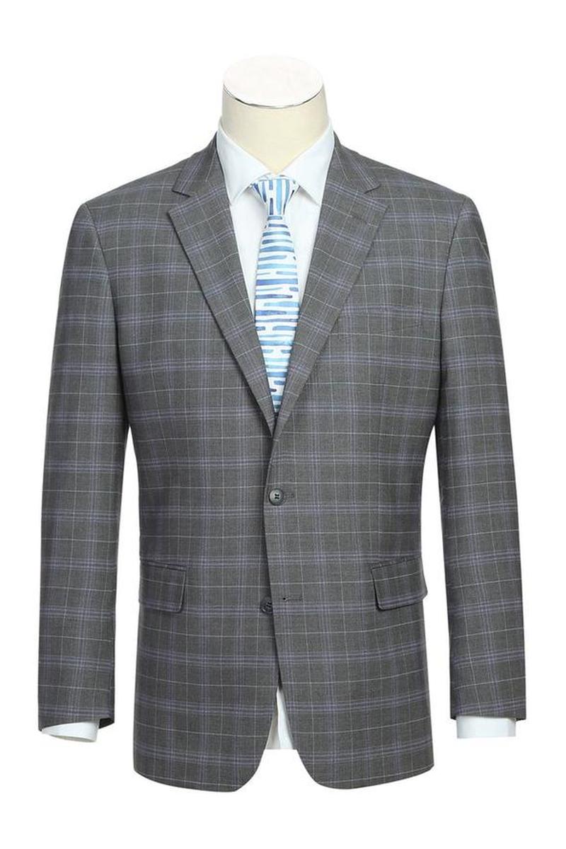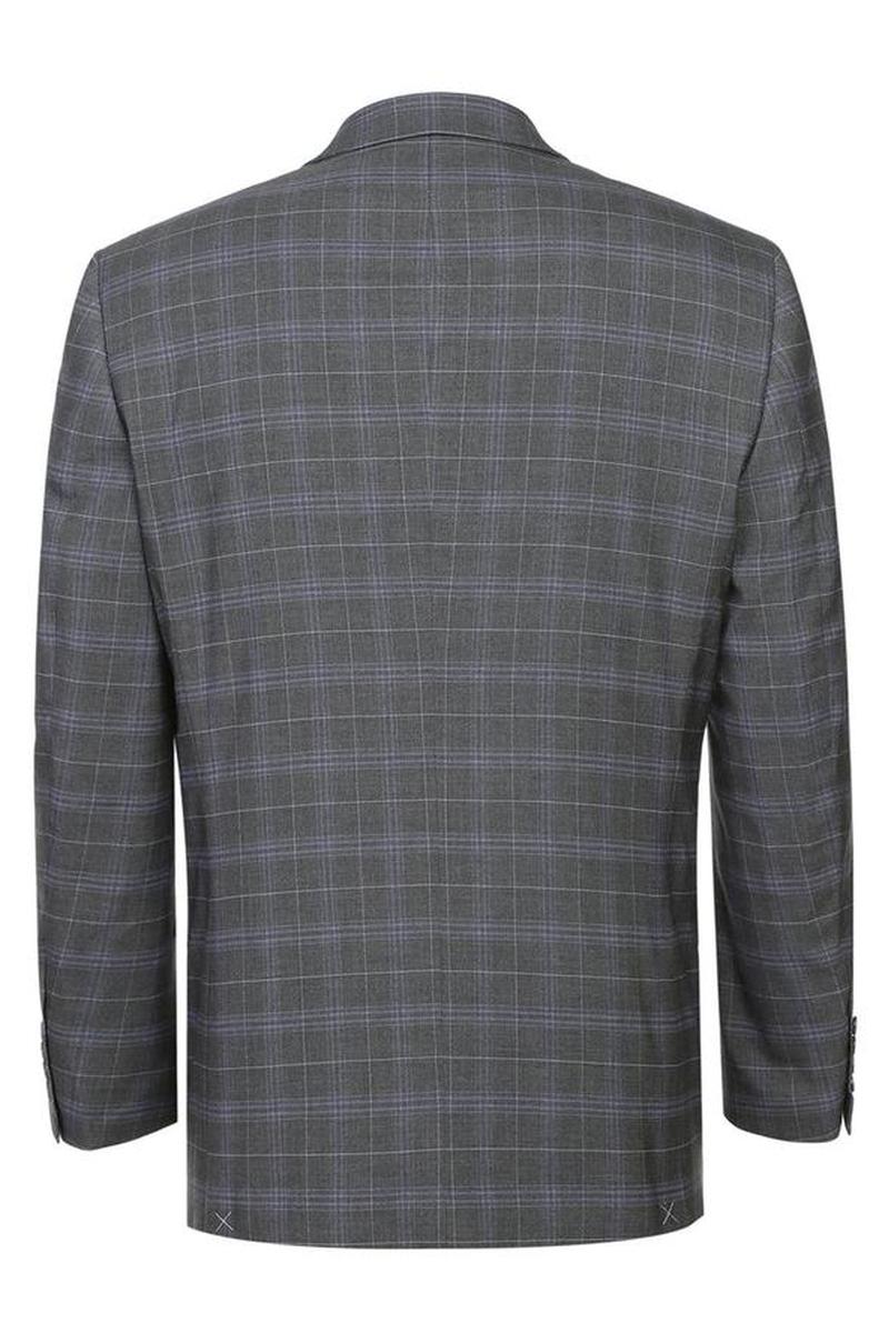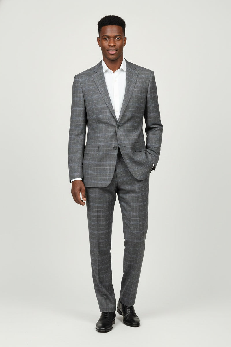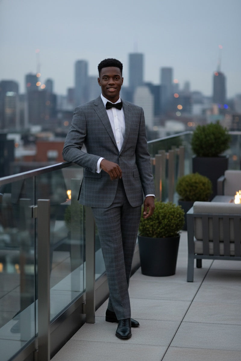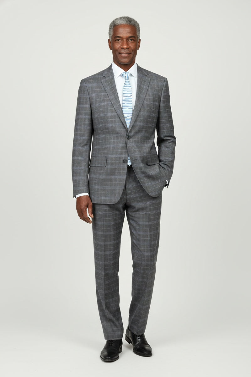 The Dimgrey Windowpane 2-Button Notch Suit, designed by Renoir, is hand-tailored in a signature classic fit and crafted using a premium poly-rayon stretch fabric. The front of the jacket features notch lapels. The front enclosure features two buttons and dual lower front besom pockets. A top welt pocket is located on the left side of the jacket to properly store a pocket square. Darts stitched down the front of the jacket are tailored to perfection giving a desired tapered shape to the garment. Towards the cuff of each jacket sleeve, there are vented sleeves once again showing that no details were overlooked in design. Lastly, let's not forget the interior of the jacket. Silky soft interior lining complemented with plenty of pocket storage provides an ultra comfortable formal wear experience.