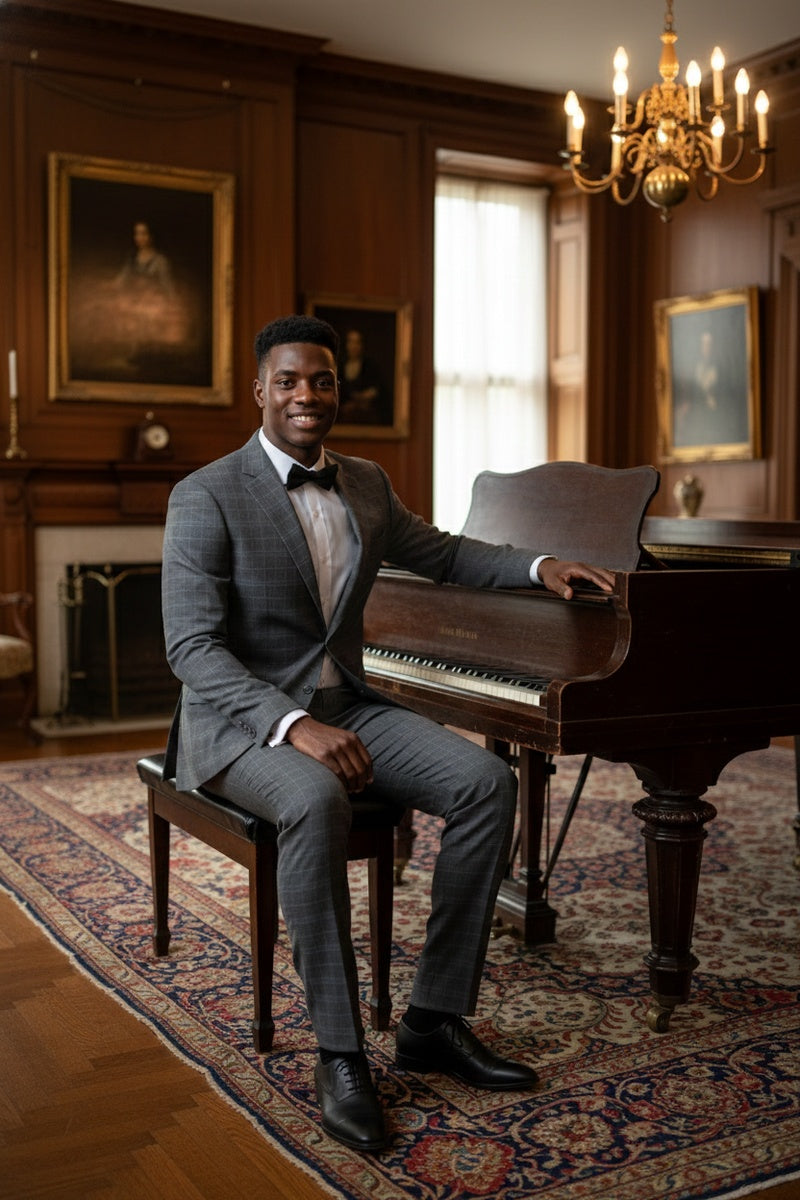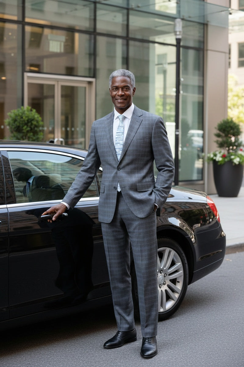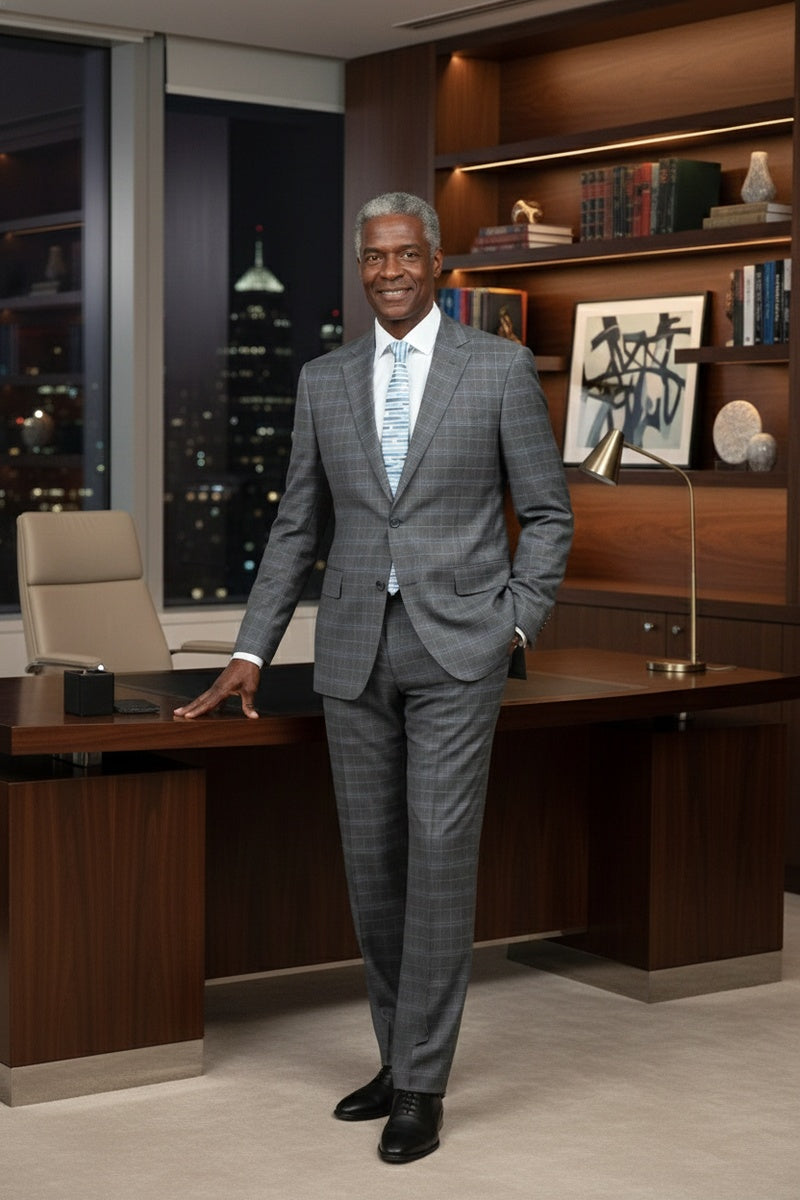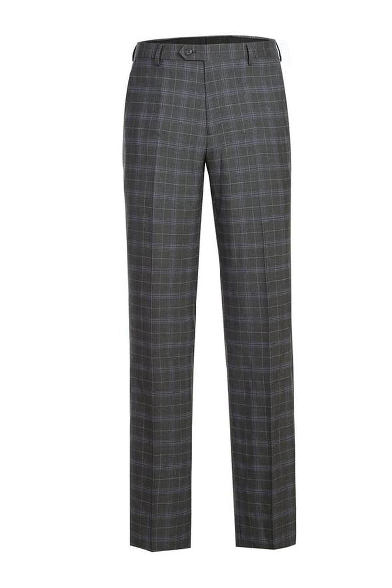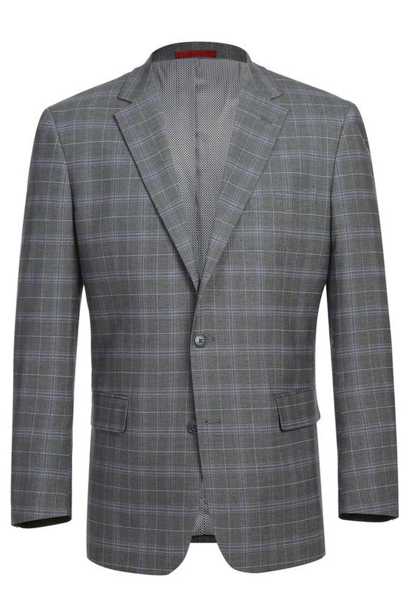 The Dimgrey Windowpane 2-Button Notch Suit, designed by Renoir, is hand-tailored in a signature classic fit and crafted using a premium poly-rayon stretch fabric. The front of the jacket features notch lapels. The front enclosure features two buttons and dual lower front besom pockets. A top welt pocket is located on the left side of the jacket to properly store a pocket square. Darts stitched down the front of the jacket are tailored to perfection giving a desired tapered shape to the garment. Towards the cuff of each jacket sleeve, there are vented sleeves once again showing that no details were overlooked in design. Lastly, let's not forget the interior of the jacket. Silky soft interior lining complemented with plenty of pocket storage provides an ultra comfortable formal wear experience.