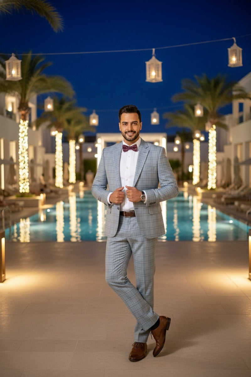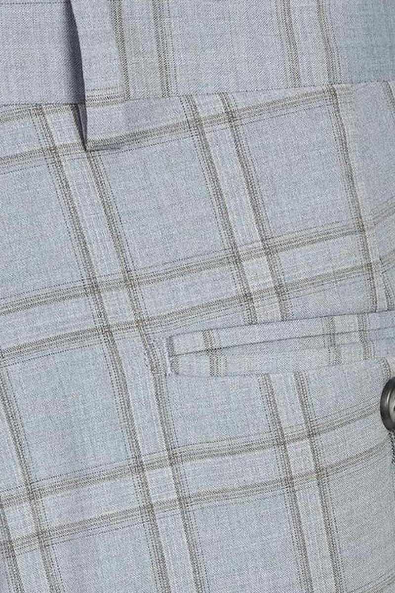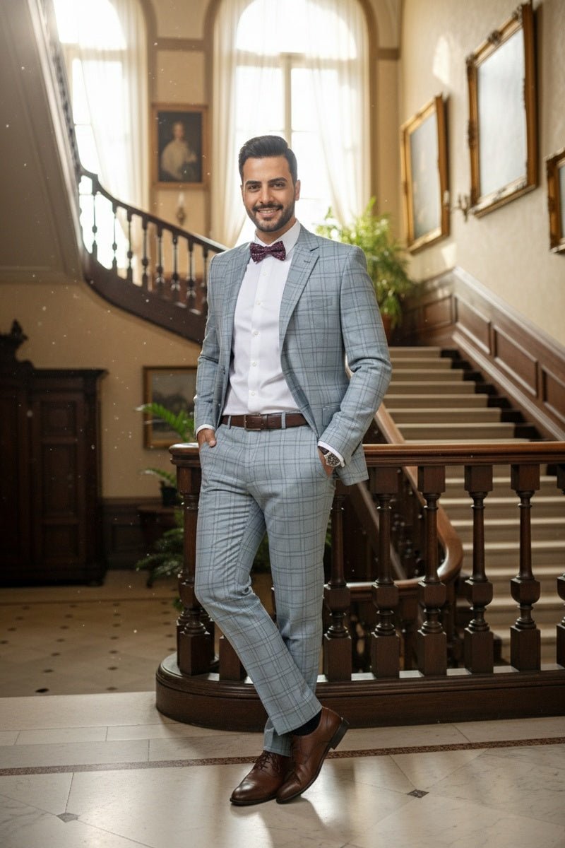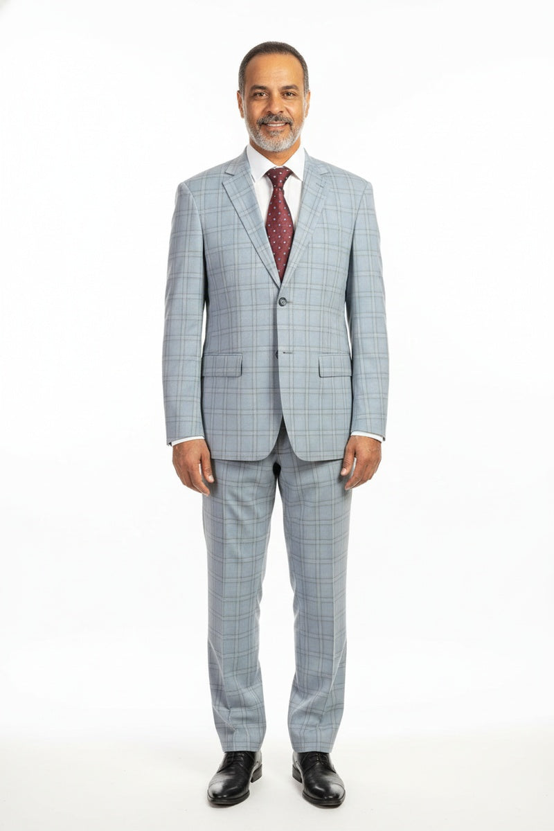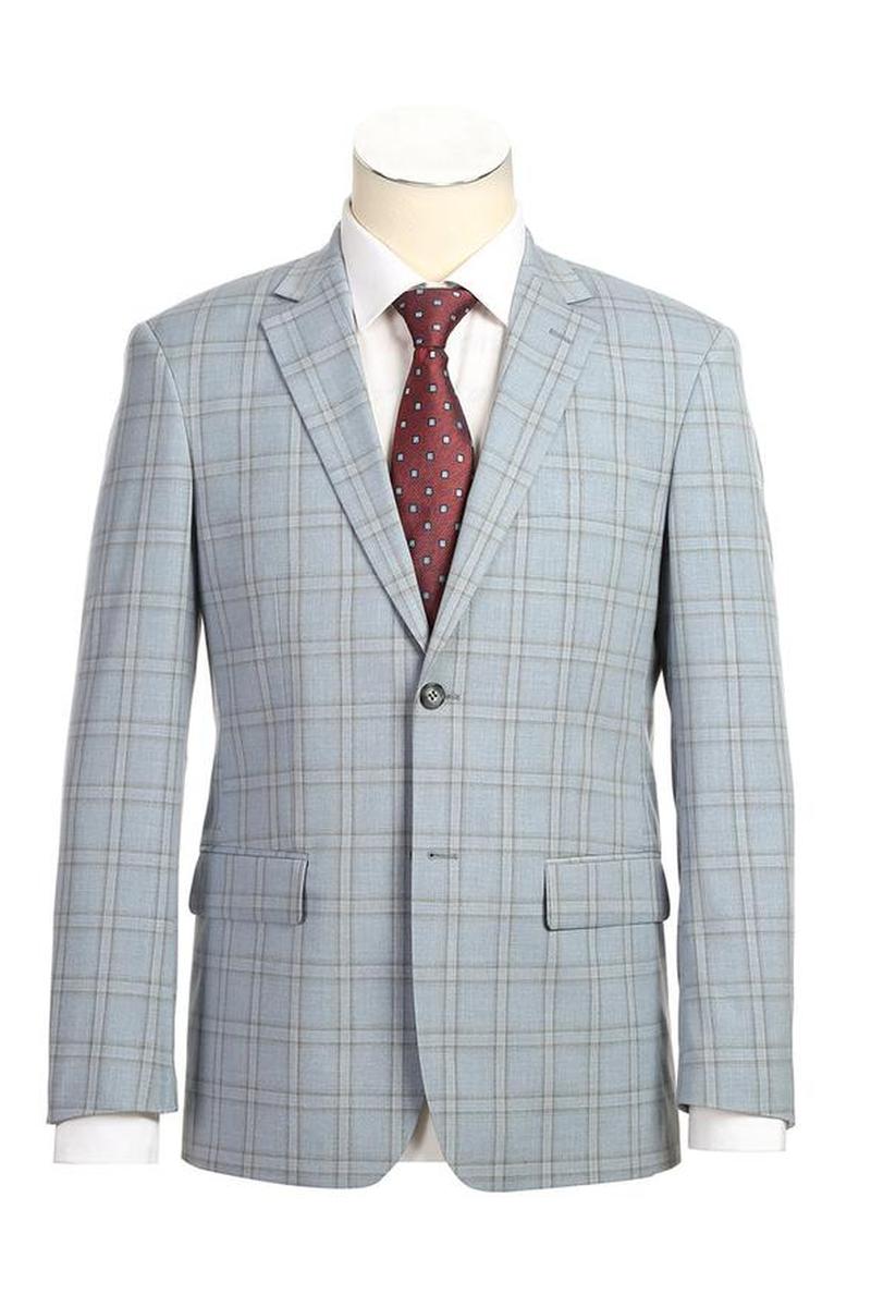 The Blue Windowpane 2-Button Notch Suit, designed by Renoir, is hand-tailored in a signature classic fit and crafted using a premiumpoly-rayon stretch fabric. The front of the jacket features notch lapels. The front enclosure features two buttons and dual lower front besom pockets. A top welt pocket is located on the left side of the jacket to properly store a pocket square. Darts stitched down the front of the jacket are tailored to perfection giving a desired tapered shape to the garment. Towards the cuff of each jacket sleeve, there are vented sleeves once again showing that no details were overlooked in design. Lastly, let's not forget the interior of the jacket. Silky soft interior lining complemented with plenty of pocket storage provides an ultra comfortable formal wear experience.